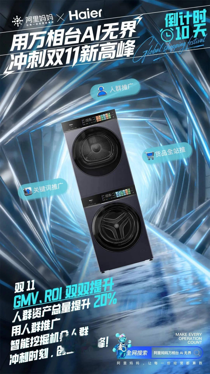 海尔通过UD内容在站外进行场景化内容种草,再利用品牌UD全域通引流至天猫沉淀,通过特秀showmax广告锁定高价值潜客,并运用货品全站推的「AI智能选品」与关键词推广的「AI动态词包」实现持续触达与高效转化,最终品牌ROI提升10%,GMV提升7%,AIPL人群总量增长20%,为冲刺大促成交积蓄了深厚的潜力客群。