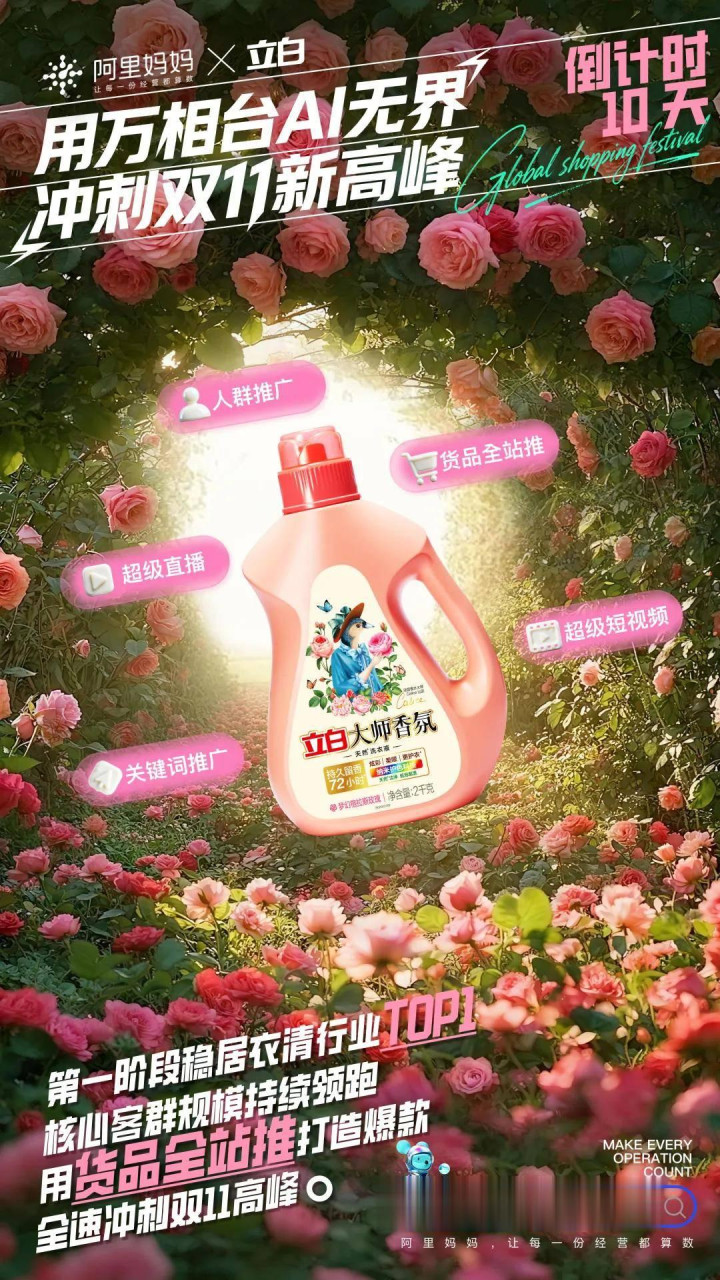立白在双11大促中,聚焦“品牌拉新”与“促销转化”两大核心场景,以前端品牌广告(如品牌特秀、Topshow、品牌专区)构建全域认知并引流;后端通过万相台AI无界强化关键词推广,锁定高意图词以构建搜索壁垒;通过人群推广精准运营新老客群,并借助货品全站推智能打造爆品组合,保障全店ROI,最终推动GMV显著提升。