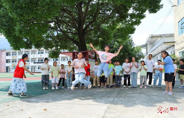 在江西省瑞昌市南义镇中心小学,来自南昌大学的大学生志愿者们与孩子们一起玩跳绳游戏。暑假期间,大学生志愿者与孩子们一起学习、共同娱乐,让孩子们开心、家长们放心。(魏东升摄/光明图片)