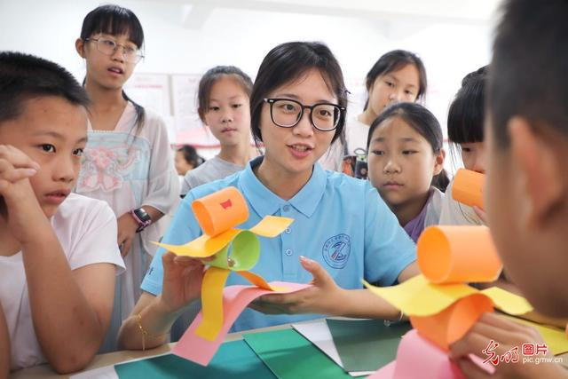 在安徽省六安市金安区望城街道正阳社区,来自合肥师范学院音乐学院的大学生刘雁在教小朋友们做手工。在正阳社区,来自合肥师范学院的12名大学生志愿者为孩子们提供思政教育、作业辅导、文体娱乐、兴趣培育等公益支教服务,让孩子们在快乐中求知成长。(田凯平摄/光明图片)