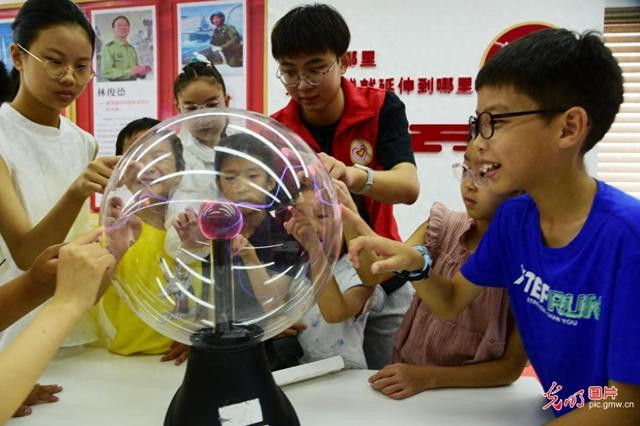 7月10日,在江苏省镇江市远洋社区,江苏大学志愿者指导小朋友体验“辉光球”的功能。当日,远洋社区联合江苏大学志愿者开展“学趣味科普度快乐暑假”活动,指导小朋友体验各种趣味物理科普实验和游戏,感受科技魅力。(石玉成摄/光明图片)