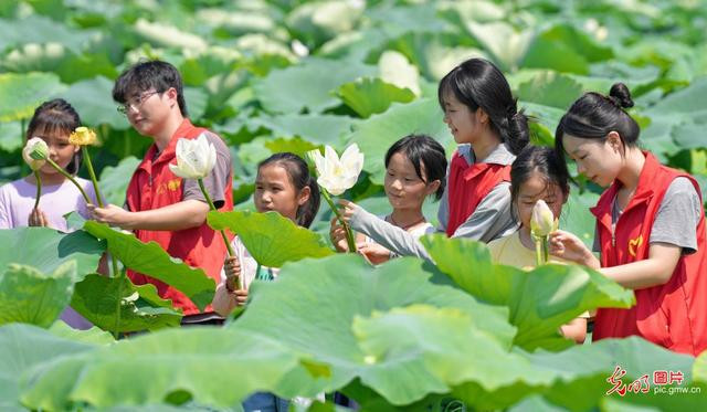 在江苏省海安市墩头镇千步村,南京工业大学建筑学院暑期支教大学生志愿者在浅水藕田边教小学生认识荷花、莲蓬,讲解莲藕生长知识。通过“田间课堂”,大学生志愿者们教孩子们认知农作物,体验农事劳动,丰富假期生活。(周强摄/光明图片)
